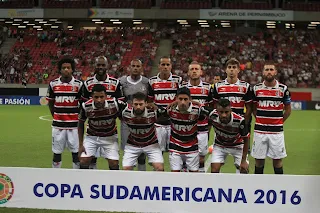 A estreia do Santa Cruz na Sul-Americana: (pé) Keno, Grafite, Tiago Cardoso, Danley, Uillian Correia, Luan Peres e Danny Morais. (agachados): Alan Vieira, João Paulo, Pisano e Léo Moura.
